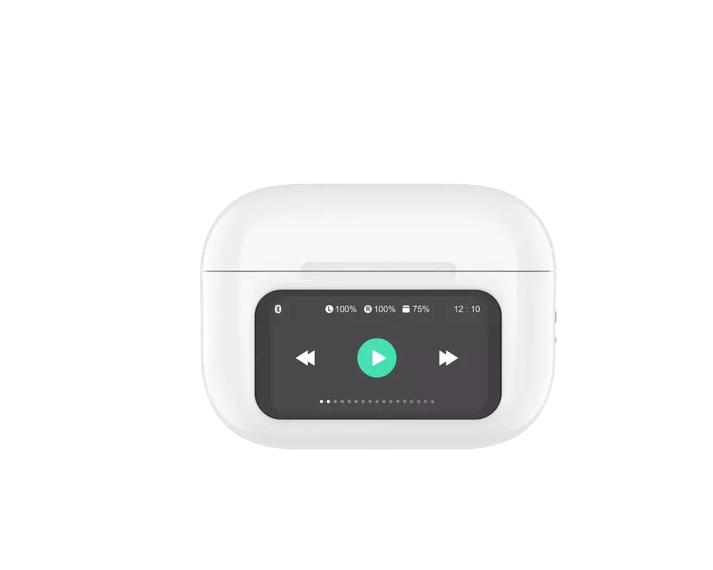 Pantalla LCD integrada en el estuche de carga, con funciones interactivas y visualización en tiempo real.