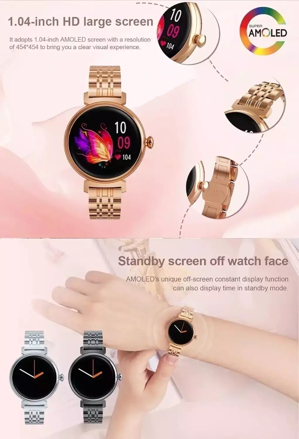 El Smartwatch DM70 ha sido diseñado especialmente para mujeres que buscan un reloj inteligente que combine estilo, comodidad y funciones avanzadas para la salud y la conectividad. Su diseño compacto, acompañado de una pantalla AMOLED de 1.04 pulgadas, ofrece colores vibrantes y un contraste excepcional, garantizando una experiencia visual de alto nivel en un formato más ligero y cómodo.